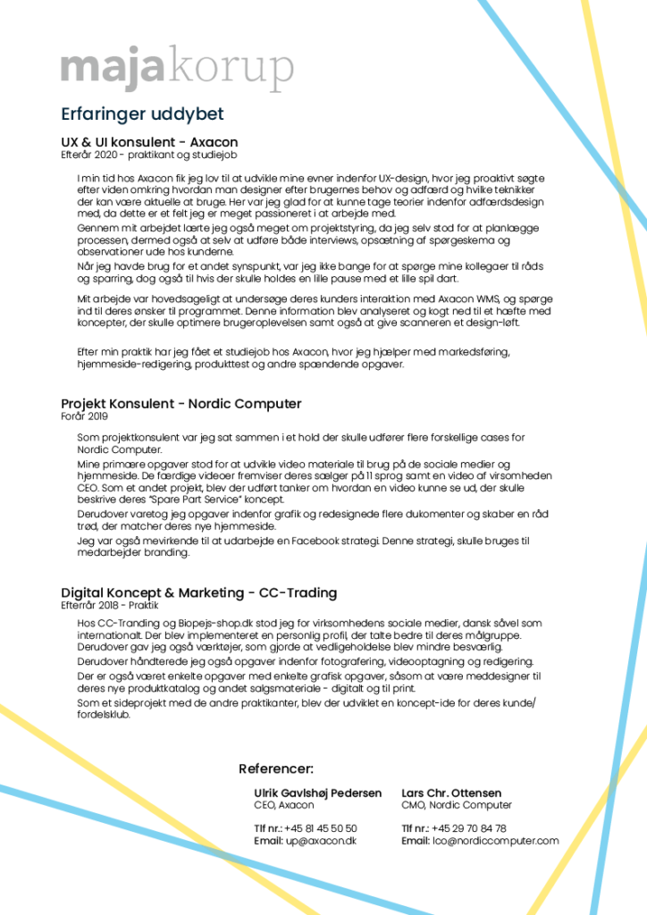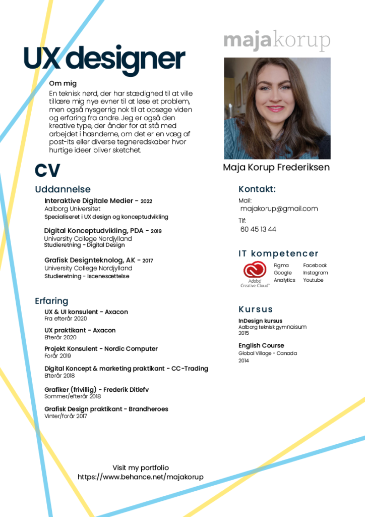 Som uddannet grafisk designer er jeg påklædt til opgaver der omhandler grafisk design. Jeg har erfaring med diverse Adobe programmer, Figma og kan nemt lære nye programmer hvis løsningen af opgaven kræver det. I min design-proces kan jeg godt lide at lave sketches der hurtigt kan visuallisere ideer og derefter tage dem ind på computeren og færdiggøre dem.